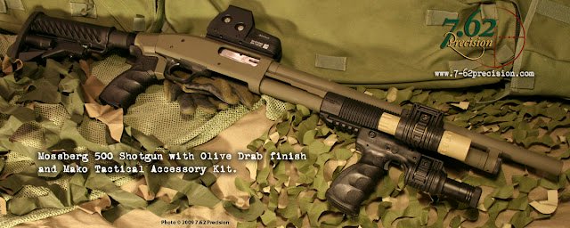 Mossberg 500 in OD and Black with The Mako Group's Tactical Shotgun Upgrade Kit