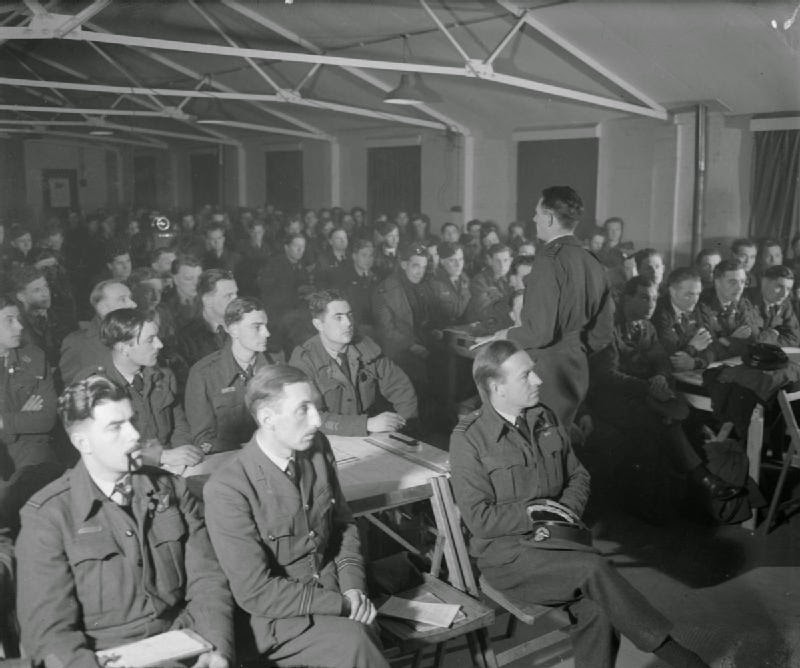 RAF Squadron Leader Peter Hill briefs bomber crews from Number 51 Squadron before the planned mission against Nuremberg, Germany on the evening on 30/31 March 1944. Hill was among more than 700 crew members lost on the raid, the bloodiest night in Bomber Command history (Imperial War Museum Collection)