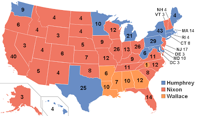 On 5th November 1968, Richard Millhous Nixon won the U.S. presidential election following a turbulent campaign that saw the assassinations of Dr. Martin Luther King and Robert Kennedy, as well violent protests on the issues of race and the Vietnam war. Nixon, the Republican candidate, received 301 votes from the Electoral College and 43.4% of the popular vote; the Democratic candidate, Hubert Humphrey, received 191 Electoral College votes and 42.7% of the popular vote; an independent candidate George Wallace (the Governor of Alabama and former Democratic candidate who ran on a pro-racial-segregation ticket) received 46 electoral votes and 13.5% of the popular vote. Thus, Nixon was duly elected to be the 37th President of the United States, taking office on 20th January 1969.
